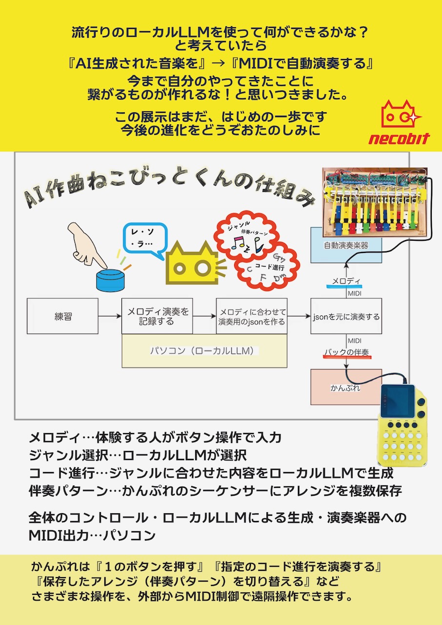 2025年10月4(土)5(日)に東京ビッグサイトにて開催された、Maker Faire Tokyo 2025 にて、AI作曲ねこびっとくん を展示しました。