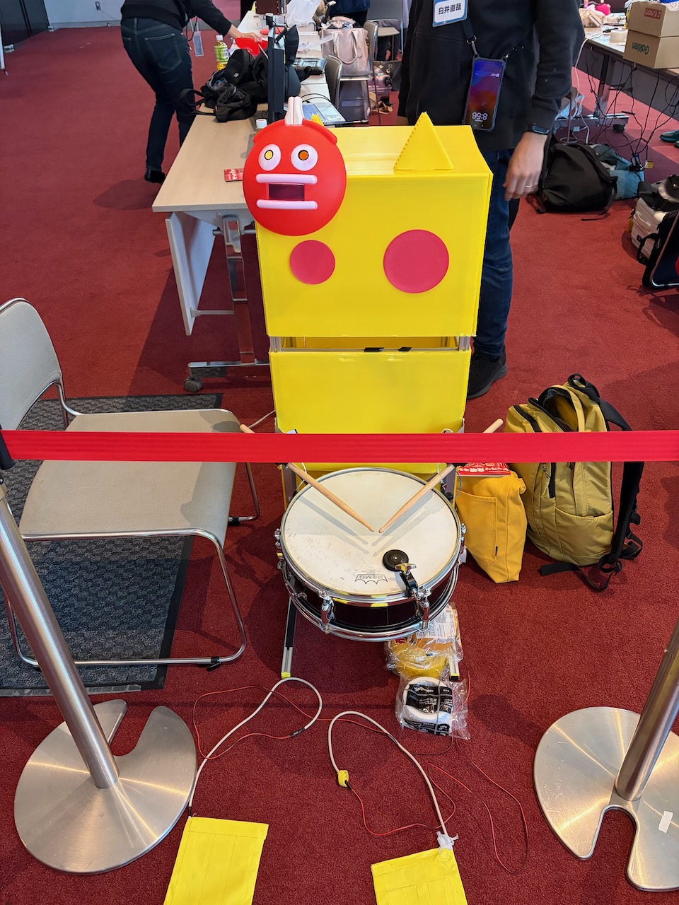 necobitブースは、ソレノイドで腕の機械を動かして太鼓を叩くスネアねこびっとくん 。来場者がマットを踏んで操作できる体験型展示にしました。